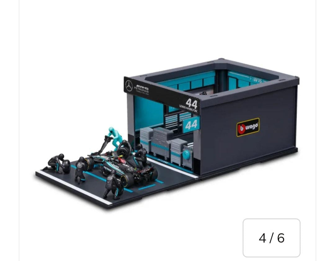 A 1:43 scale diorama set of the Mercedes AMG W15 F1 car and pit crew during a 2024 Formula 1 pit stop. This diorama beautifully portrays the speed and precision of the team's pit operations, a perfect collectible for fans of Mercedes and F1 racing.