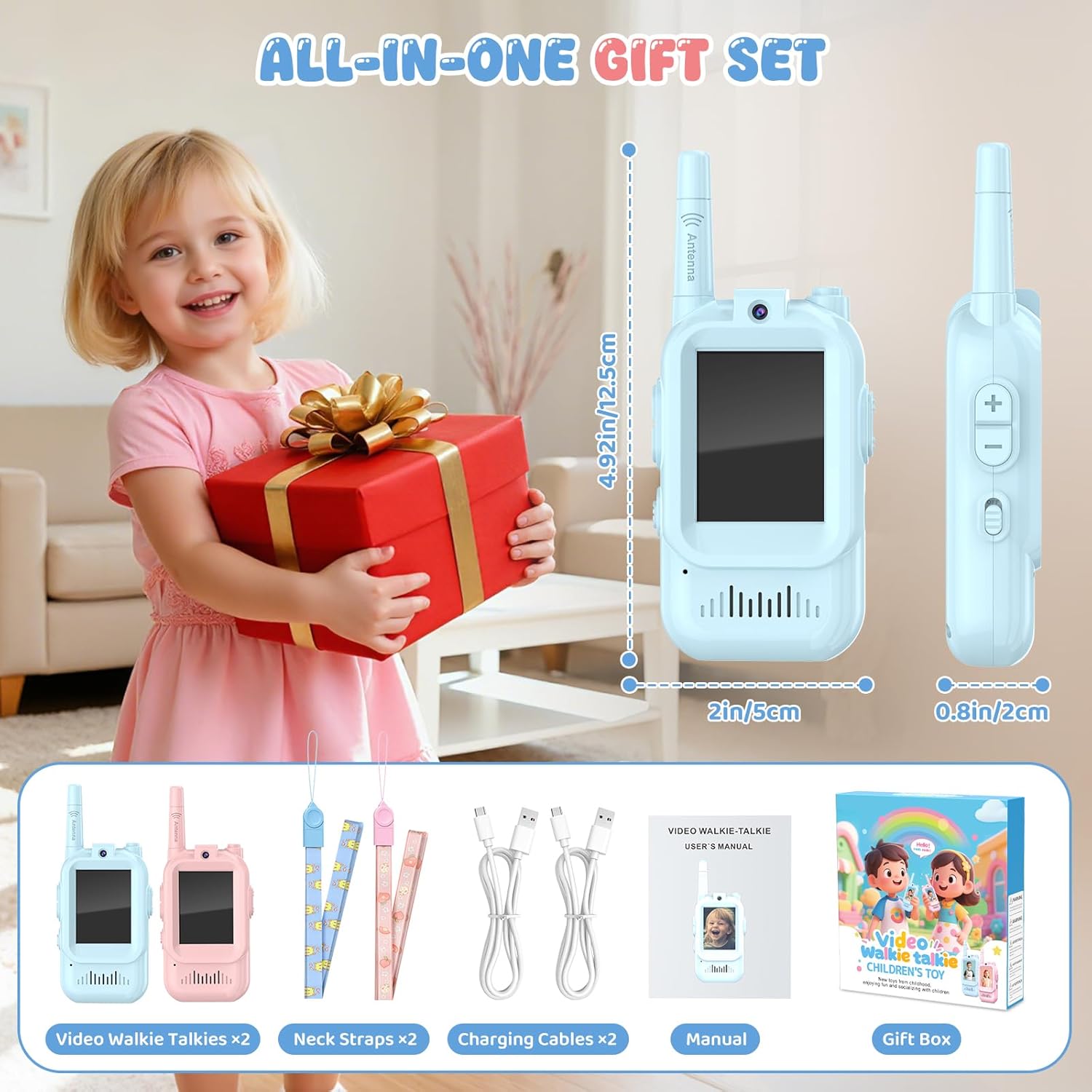 - Perfect Gift for All Ages: A fun and practical gift for boys and girls ages 3–12. Whether it's for Christmas, birthdays, valentine day, Easter, holidays, or family gatherings, this video walkie talkie adds excitement and bonding to every home. Suitable for indoor play, outdoor adventures, travel, camping, and family activities, making it a wonderful gift that enhances communication and brings the whole family closer